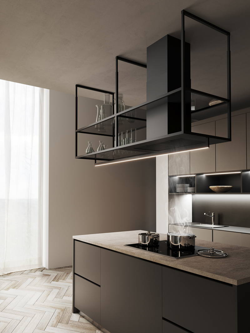 WAIES MOKA隐藏式升降烟机,真正做到厨房视觉一体化设计,重新梳理了空间架构,被做成一键操控格局,嵌入柜体隐匿于无形,就成为了自由改变空间的解决方案。
